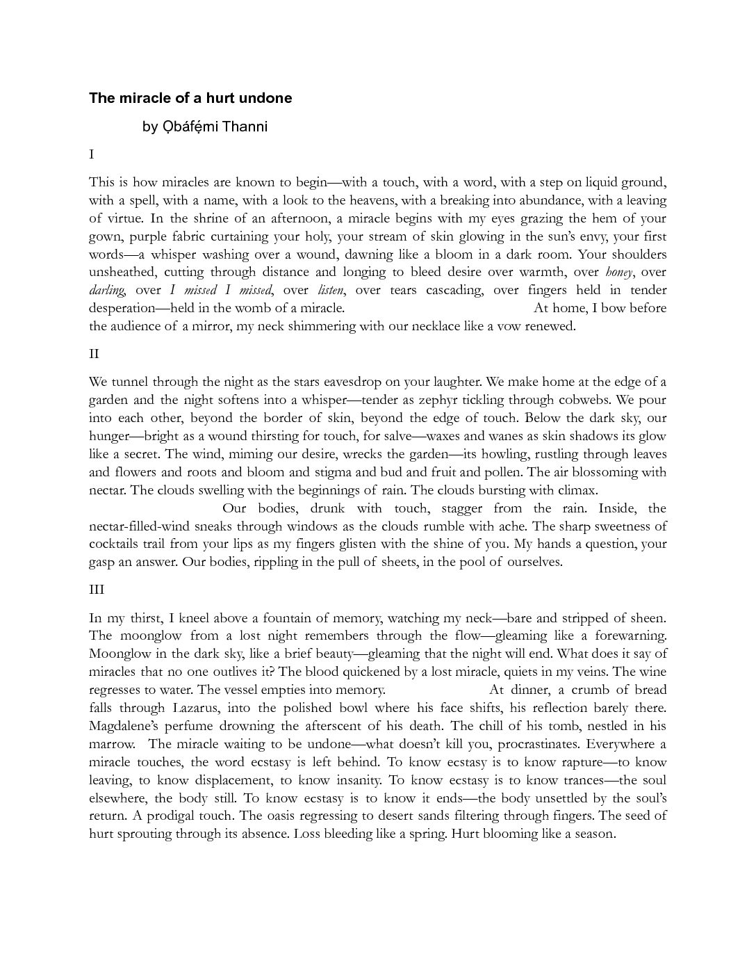 In my thirst, I kneel above a fountain of memory, watching my neck—bare and stripped of sheen. The moonglow from a lost night remembers through the flow—gleaming like a forewarning. Moonglow in the dark sky, like a brief beauty—gleaming that the night will end. What does it say of miracles that no one outlives it? The blood quickened by a lost miracle, quiets in my veins. The wine regresses to water. The vessel empties into memory. At dinner, a crumb of bread falls through Lazarus, into the polished bowl where his face shifts, his reflection barely there. Magdalene's perfume drowning the afterscent of his death. The chill of his tomb, nestled in his marrow. The miracle waiting to be undone—what doesn't kill you, procrastinates. Everywhere a miracle touches, the word ecstasy is left behind. To know ecstasy is to know rapture—to know leaving, to know displacement, to know insanity. To know ecstasy is to know trances—the soul elsewhere, the body still. To know ecstasy is to know it ends—the body unsettled by the soul's return. A prodigal touch. The oasis regressing to desert sands filtering through fingers. The seed of hurt sprouting through its absence. Loss bleeding like a spring. Hurt blooming like a season.